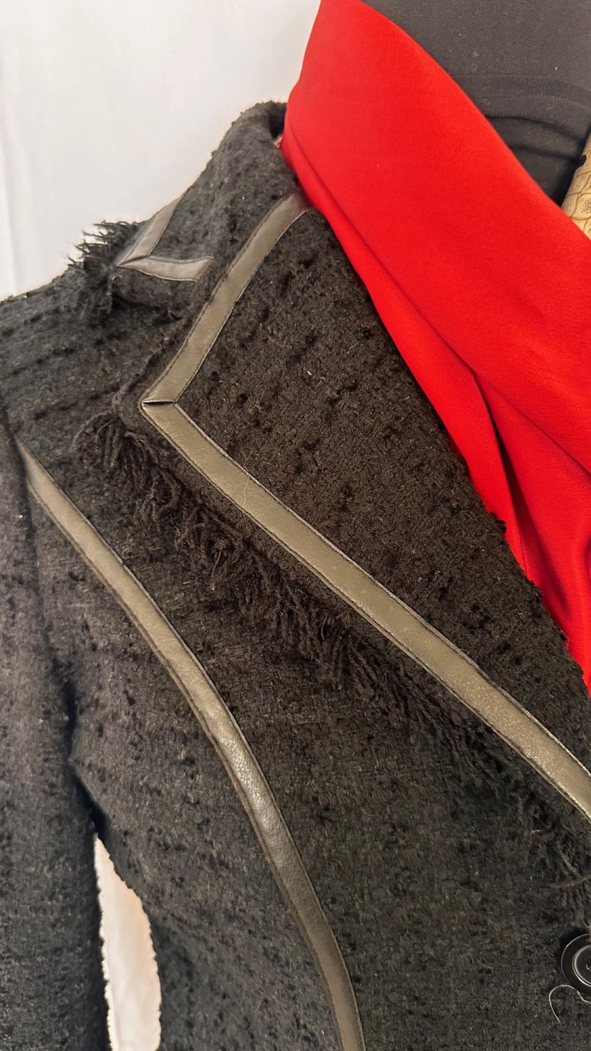 Detailed with leather piping outlining collar, flap pkts & shaped silhouette on textured chenille type fabric.